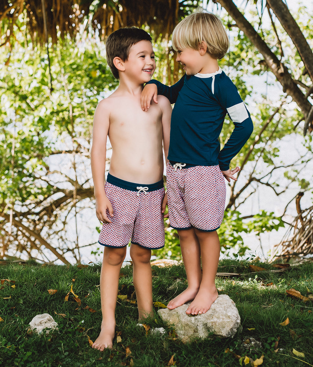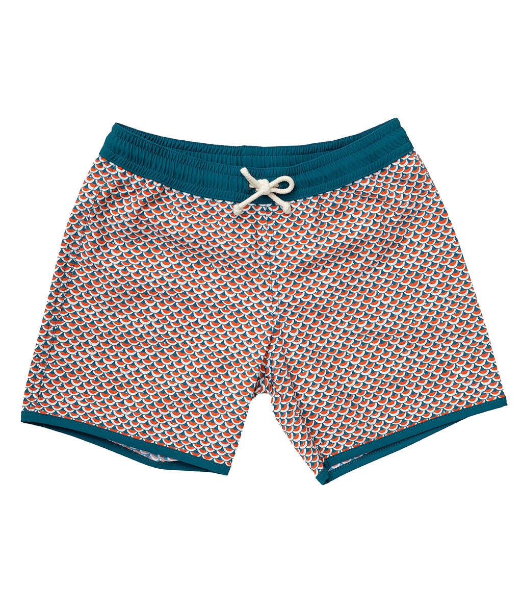 Our new Folpetto exclusive fish-scales print in teal and cinnamon hues have a mesh lining for comfort and an adjustable drawstring waistband for your growing little rays of sunshine.