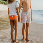 They have a mesh lining for comfort and an adjustable drawstring waistband, and our new Folpetto exclusive fish-scales print in cloud grey and mandarinred hues, can be paired with our Leonardo and Spencer rashguards and matched perfectly with our Isabella swimpants.
