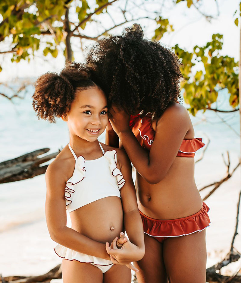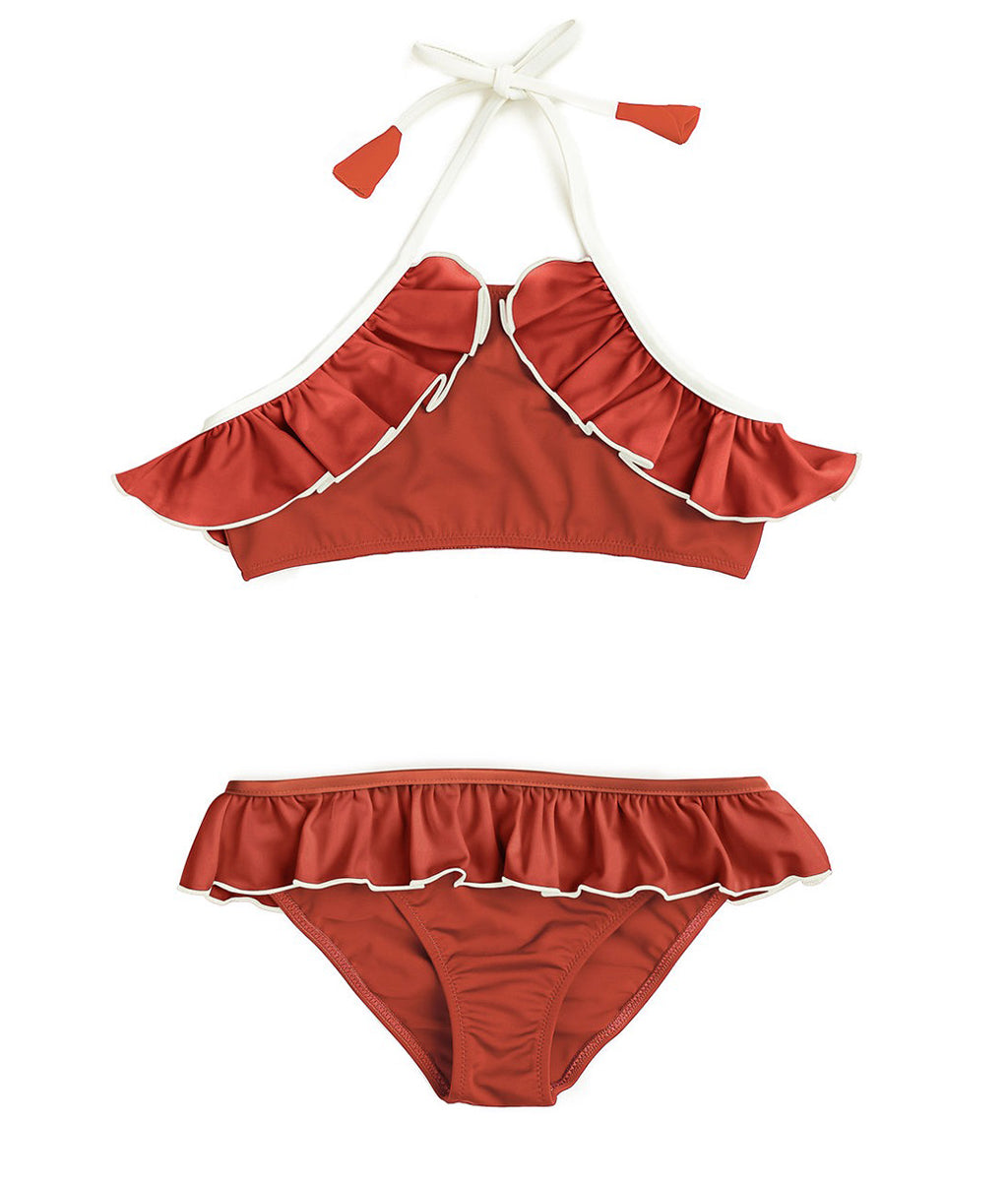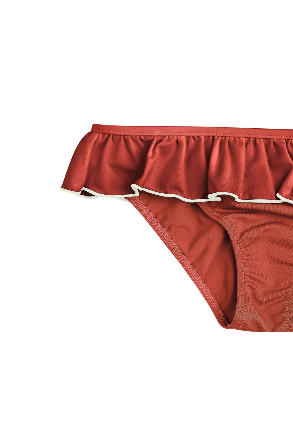 This perfect sweet bikini in terracotta features a delicate ruffle and a sophisticated contrast trim in ivory. It has thoughtful details and can be adjusted at the back of the neck for perfect fit and comfort.