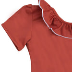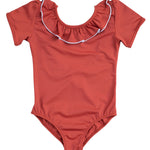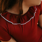 Our Carlotta surfsuit has a short puffy sleeves and and a beautiful open back with our signature frill and contrast trim