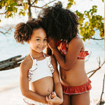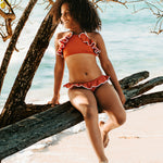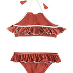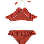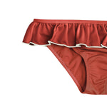 This perfect sweet bikini in terracotta features a delicate ruffle and a sophisticated contrast trim in ivory. It has thoughtful details and can be adjusted at the back of the neck for perfect fit and comfort.