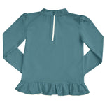 Our Lucinda rashguard in Night blue features a sweet ruffle with a Ivory contrast trim, all while being super practical thanks to the neck zip that makes it easy to take on and off.