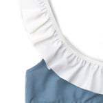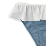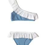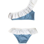 The super sweet one shoulder MAIA bikini with an elegant all-around pleat, oozes charm and retro seaside chic. It comes two dreamy and delicate colour variations: dusty blue and ivory, and peach pink and ivory. It is made with super soft fabric, which is also suncream, oils and chlorine resistant as well as blocking over 99.8% of harmful sun rays, making it the ideal bikini for the beach and the pool this summer.
