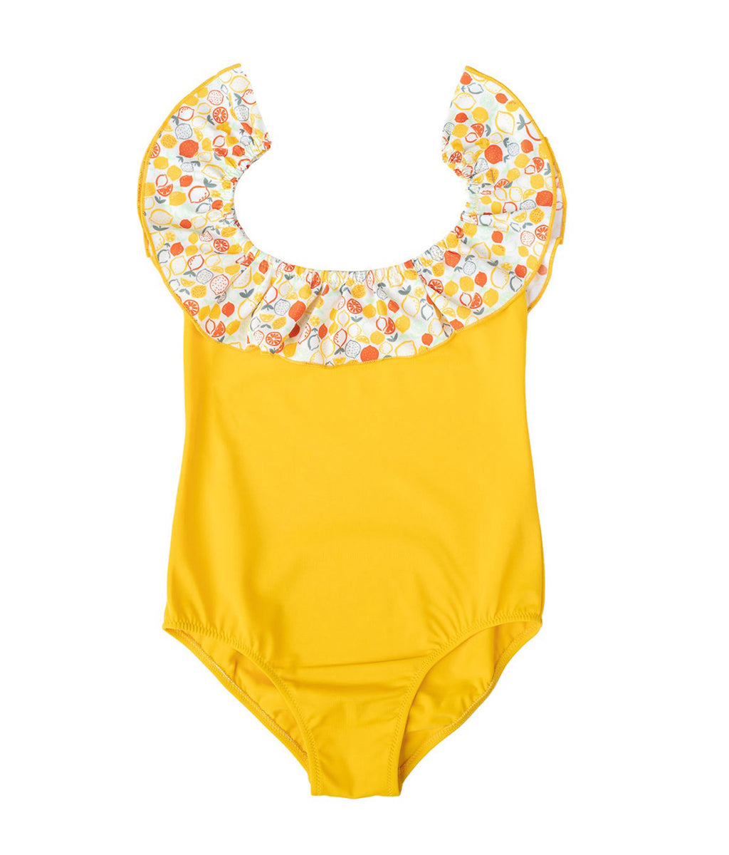 Made with supersoft regenerated fabric in our new Sicilian yellow hue, this classic one piece has our signature ivory ruffle in our exclusive Sicilian Lemon print. The ruffle which can be worn both on or off the shoulder for a super stylish look.