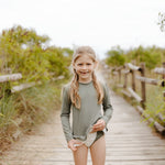 Elegance and sunprotection blend perfectly together in our romantic LUCIE rashguard in sage green, with soft plaits on the waist. Made with super soft recycled fabric, protects children’s delicate skin and blocks 99.8% of sun’s harmful UVs.
