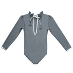 The long sleeves and high neck ruffle provide perfect sun protection coverage while oozing beauty. The sweet and thoughtful details like the ivory contrast in the sleeves' hems and back perfectly balance the Pebble grey, giving it a modern touch.